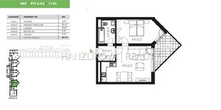 Byt o výměře 50,25 m² tvoří vstupní chodba s vestavěnou skříní, koupelna s vanou a toaletou a světlý obývací pokoj s kuchyňským koutem, vybavený spotřebiči a přímým vstupem na terasu orientovanou do vnitřní části areálu, ložnice s manželskou postelí- viz. fotografie. Přístup na terasu je možný z obou hlavních pokojů(ložnice, obývací pokoj).
