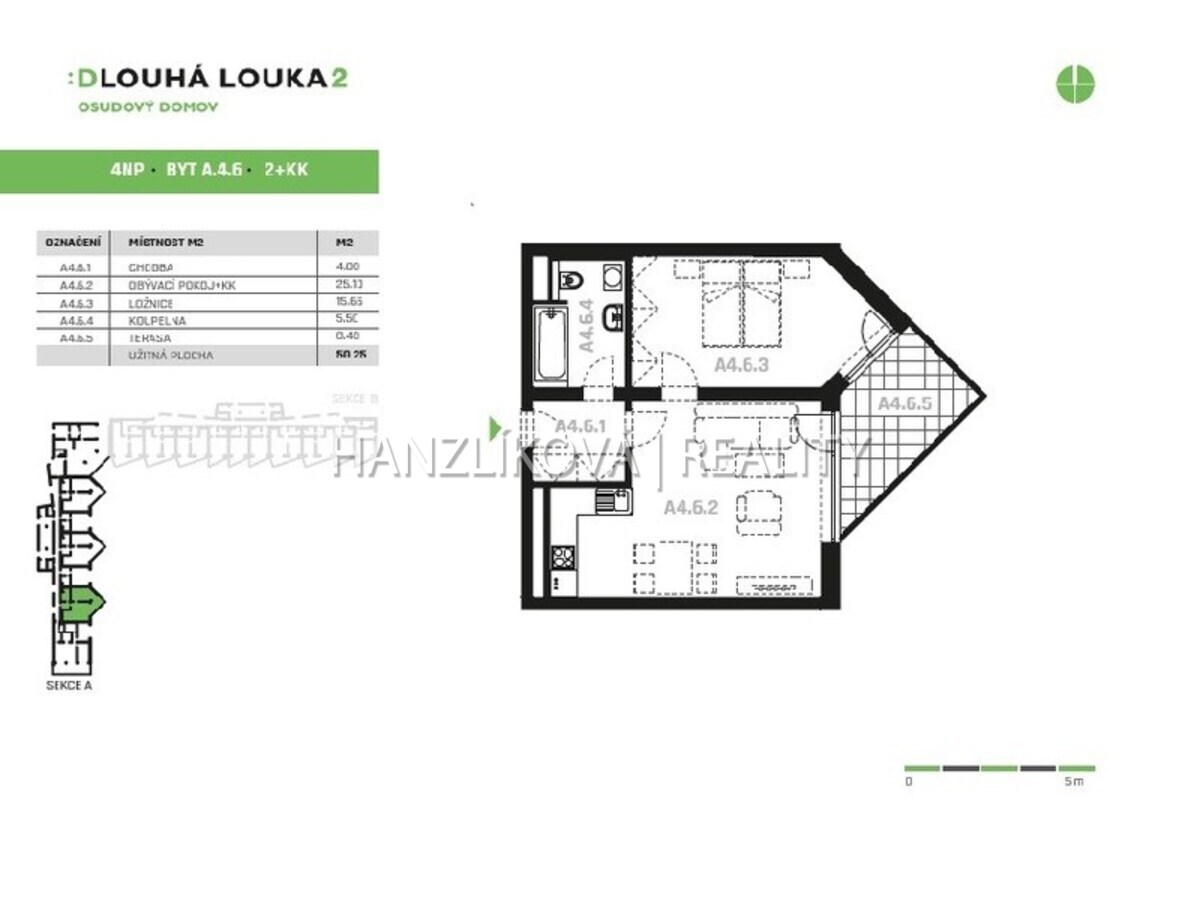 Nabízíme k pronájmu zcela novou bytovou jednotku č. A.4.6 o dispozici 2+kk s prostornou terasou (8,40 m²), která se nachází ve 4. nadzemním podlaží nového rezidenčního komplexu DLOUHÁ LOUKA 2. etapa.