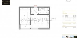 „residence Hálkova“. Byt o výměře 36,6 m2 je dispozičně řešen jako