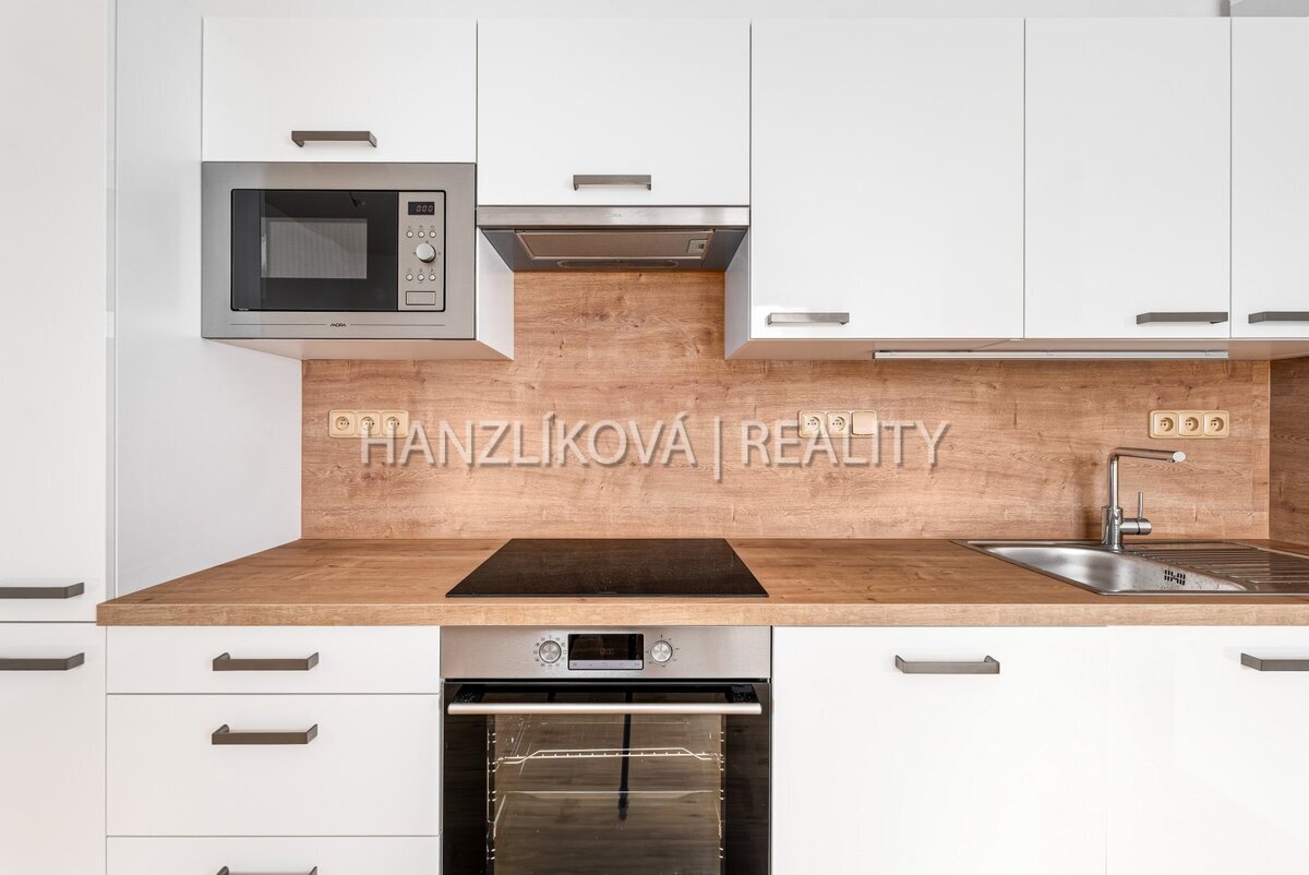 je vybaven kuchyňskou linkou na míru včetně veškerých spotřebičů.