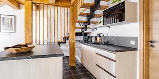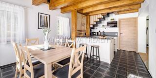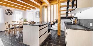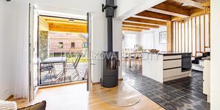 kuchyně s jídelnou a přímým vstupem na terasu, obývací pokoj s krbem,