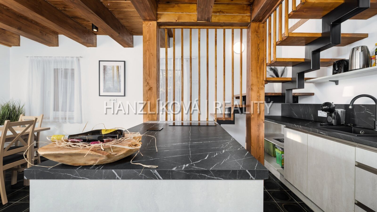 kuchyně s jídelnou a přímým vstupem na terasu, obývací pokoj s krbem,