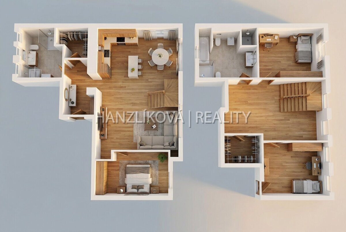 Byt je řešen jako prostorný mezonet, který nabízí příjemné oddělení